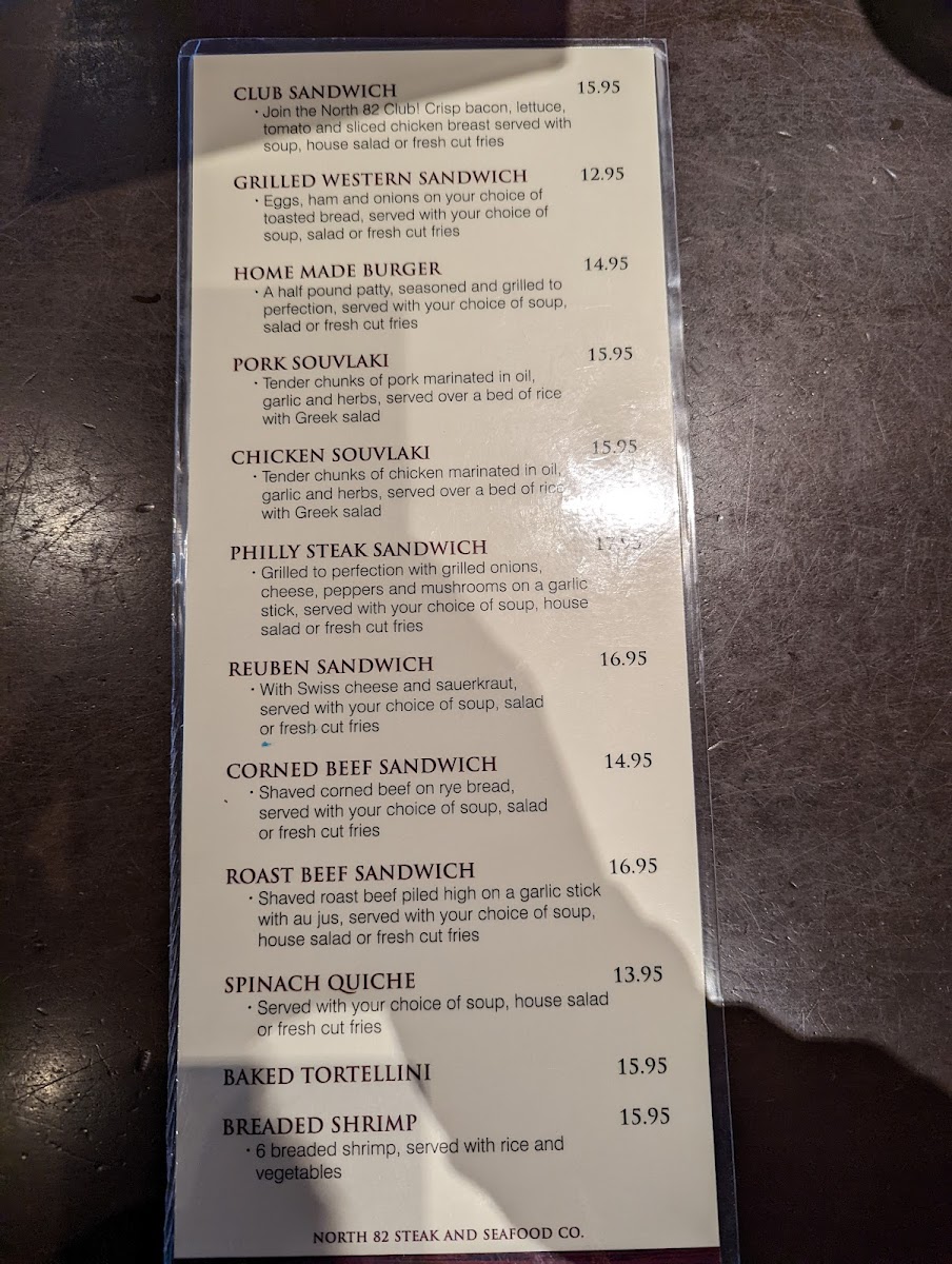 The highlight of the menu includes succulent New York steaks and classic sandwiches like the New York Steak Sandwich and Prime Rib Sandwich. For pasta lovers, the Baked Tortellini with Cheese and the Seafood Pasta with Shrimp and Scallops will tantalize your taste buds.